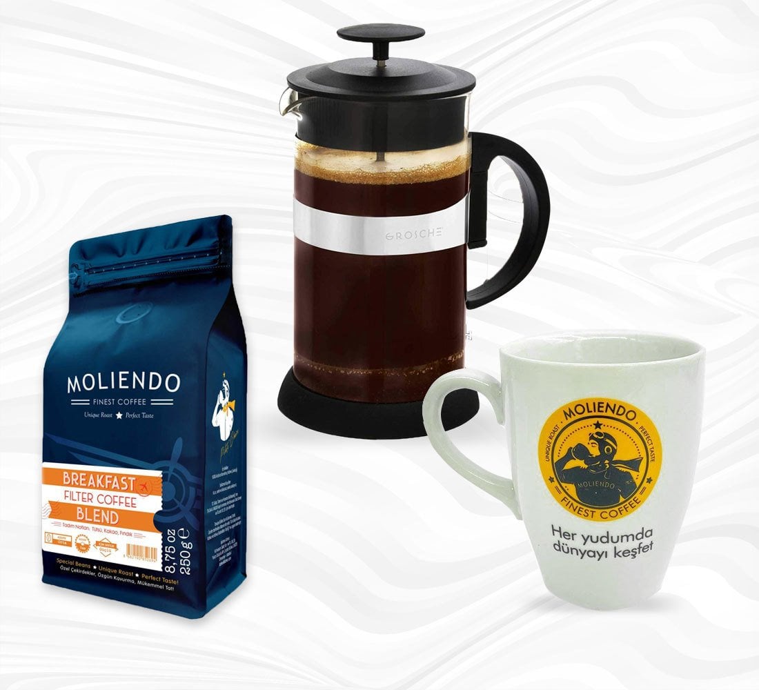 Moliendo Breakfast Blend Filtre Kahve 250 gr, Grosche Zurich French Press Siyah 3 Cup 350 ml, Moliendo Finest Coffee Mug 120 ml.