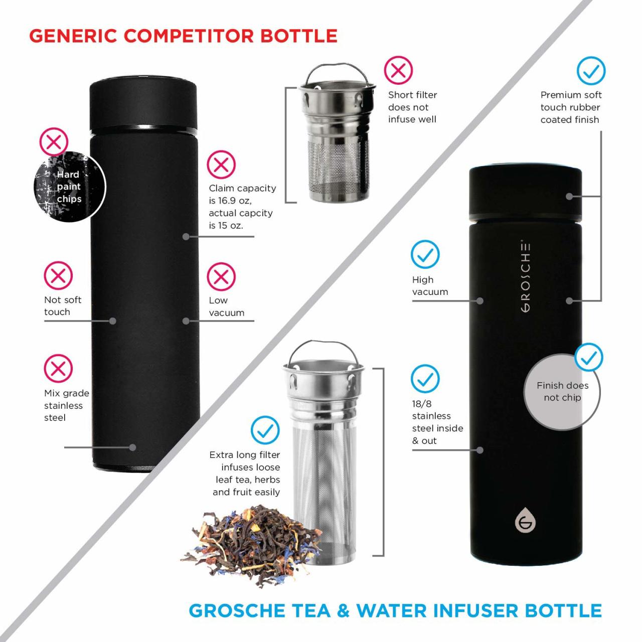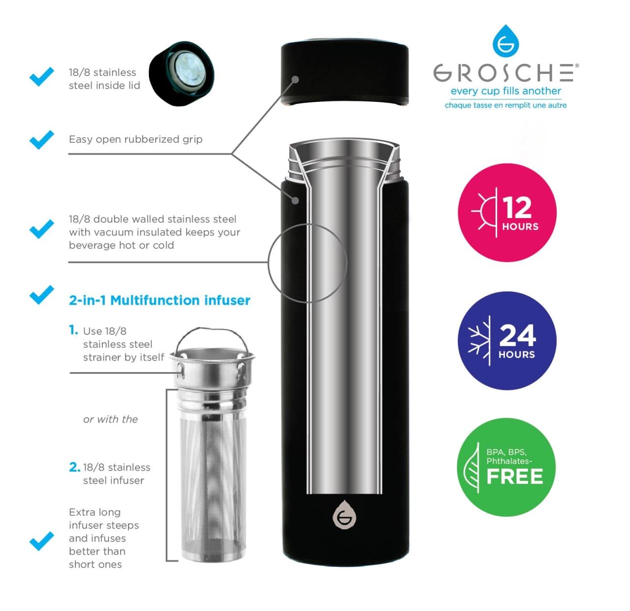 Grosche Chicago serisi çelik çay demleme termosu da özellikle 12 saat sıcak tutma ve 24 saat soğuk tutma süresiyle bu keyfi sonuna kadar yaşamanızı sağlayacak bir imkân sunuyor. İçerisindeki filtre haznesi 18/8 paslanmaz çelikten yapılmış olup muadili ürünlere göre en büyük farkı uzun bir yapısı olması. Böylece özellikle uzun saplı bitkilerle demleme yapabilmenizi sağlamasının yanı sıra demlemenin termosun bütününde oluşmasını sağlaması ile de alacağınız lezzeti artırıyor diyebiliriz.