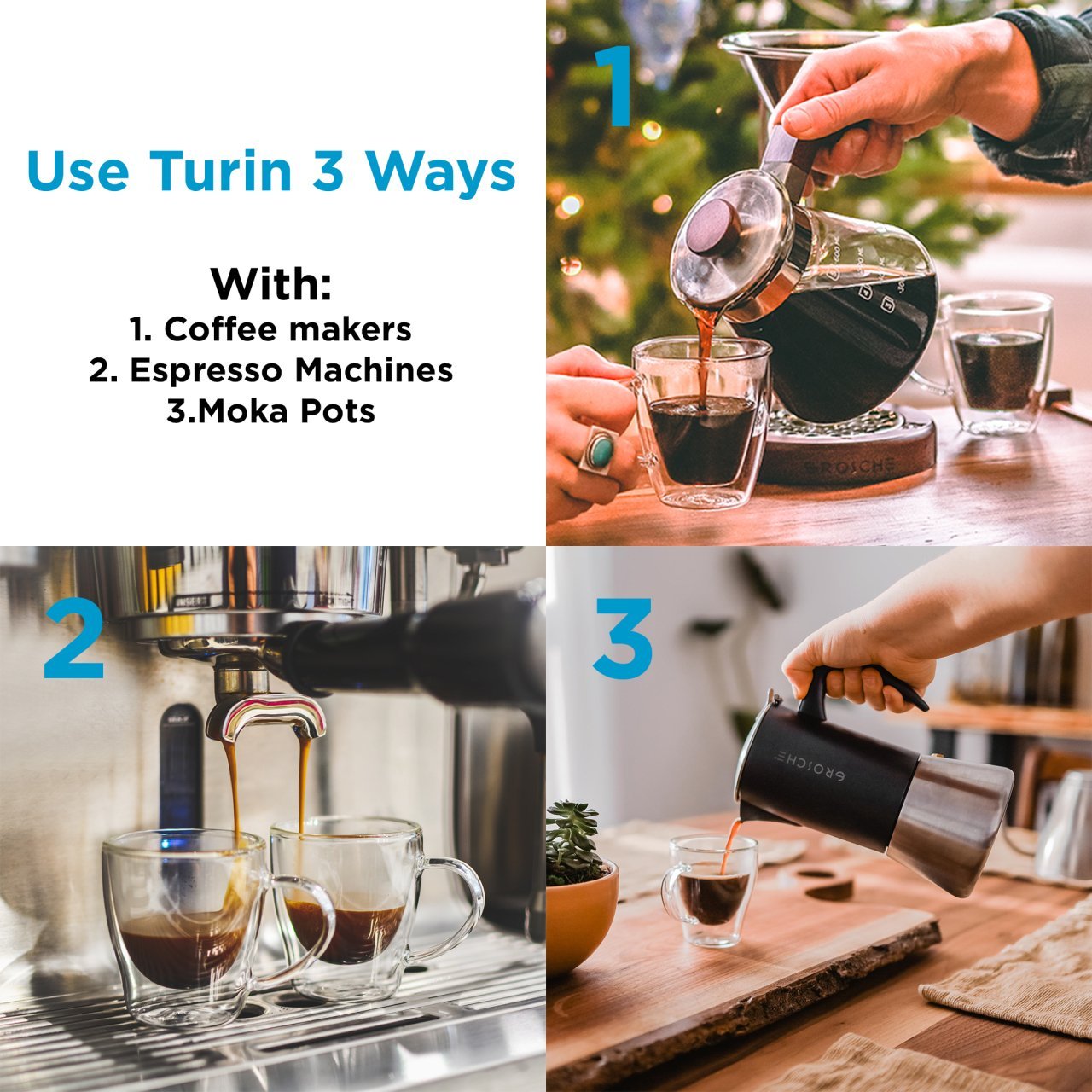 Turin Çift Cidarlı Espresso Bardağı ile bu sürece adım adım şahit olacaksınız. Özellikle ilk damlalardan sonra kremanın oluşarak dipten yukarı doğru çıkışını seyretmek ve nihayetinde espressonun sertliği ile kremanın yumuşacık güzelliğini bir arada görmek paha biçilmez keyiflerden.