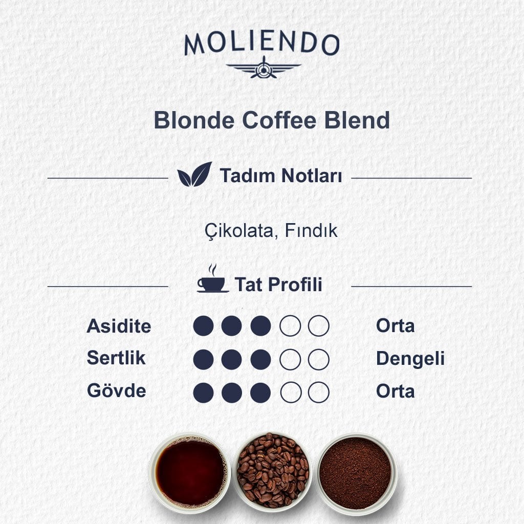 Moliend Blond Coffee Blend’de biz Robusta çekirdeği kullanmadık. %100 Arabica çekirdeklerinden oluşturduğumuz bu harmana diğer harmanlarımızdan daha farklı bir bakış açısıyla yaklaştık. Cafe’lerde içtiğiniz kahveyi evde de hazırladığınızda benzer tatları alabilmeniz için kavurma derecemizi biraz daha dengeledik. Özellikle espresso ile hazırlanan sütlü içeceklerde yumuşak içimi sağlasın ama kahve belirginliğini de korusun istedik.