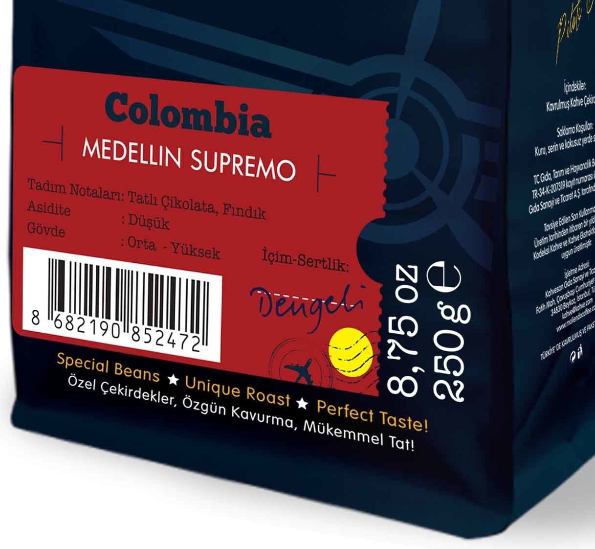 Kolombiya kahveleri sınıflandırılırken yetiştirildikleri bölgelere ve çekirdek boyutlarına göre isimlendiriliyorlar. Bölgeyi, Kolombiya’ya özgü bir ticari sınıflandırma olan excelso, supremo, extra gibi boyutla ilgili sıfatlar tamamlıyor. Örneğin, excelso daha küçük taneler, supremo ise daha iri kahve taneleri için kullanılıyor. Kahve.com olarak Medellin, Kolombiya’dan getirdiğimiz bu kahvenin elek boyu olan supremo, 17/18 elek (Scr.) ve üstüne denk düşüyor diyebiliriz.