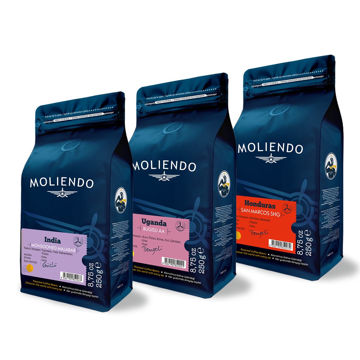 Çikolata ve karamel tadım notalarında Moliendo Honduras San Marcos.Tatlı, hafif ahşapsı tadım notalarında Moliendo India Monsooned Malabar.Şarapsı, çikolata, üzüm, kiraz tadım notalarında Moliendo Uganda Bugisu.