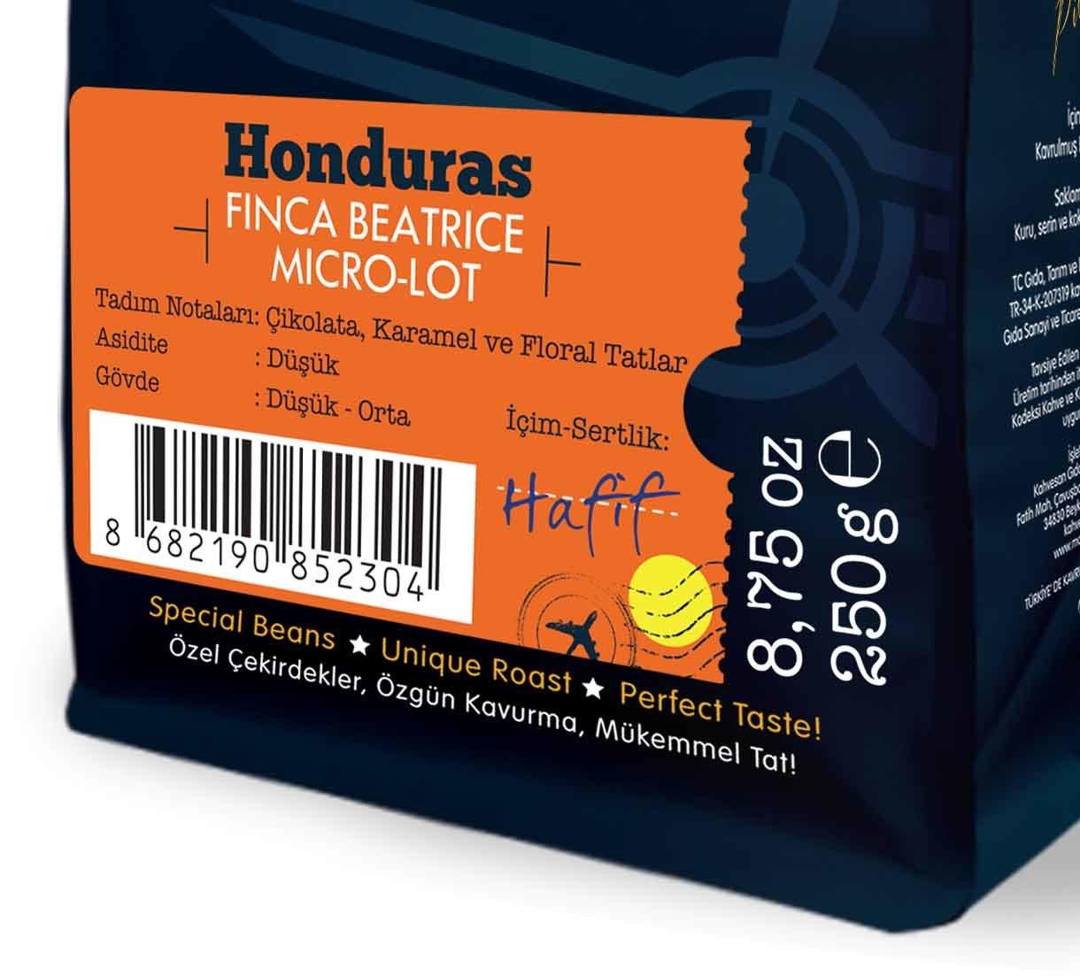 Finca İspanyolca'da çiftlik demek. Honduras’ın Copan bölgesinde yer alan Beatriz çiftliği kahvenin yanı sıra kakao üretimi de yapan bir çiftlik. Çevresinde yetişen diğer meyve ve bitkilerin aromasını da alma gibi bir özelliğe sahip olan kahve meyvesi, çiftlikteki kakaolardan olsa gerek after-taste veya finish diye adlandırılan, kahve yutulduktan sonra ağızda bıraktığı tatta pürüzsüz bir kakao hissi uyandırıyor diyebiliriz.